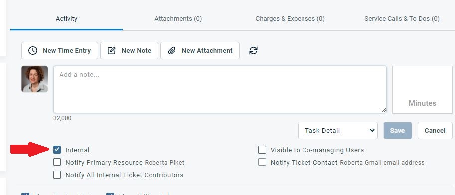 Internal Note added by a resource | The note will be visible to internal (GGIT) resources when they view the ticket. It will not be visible via the client portal. |