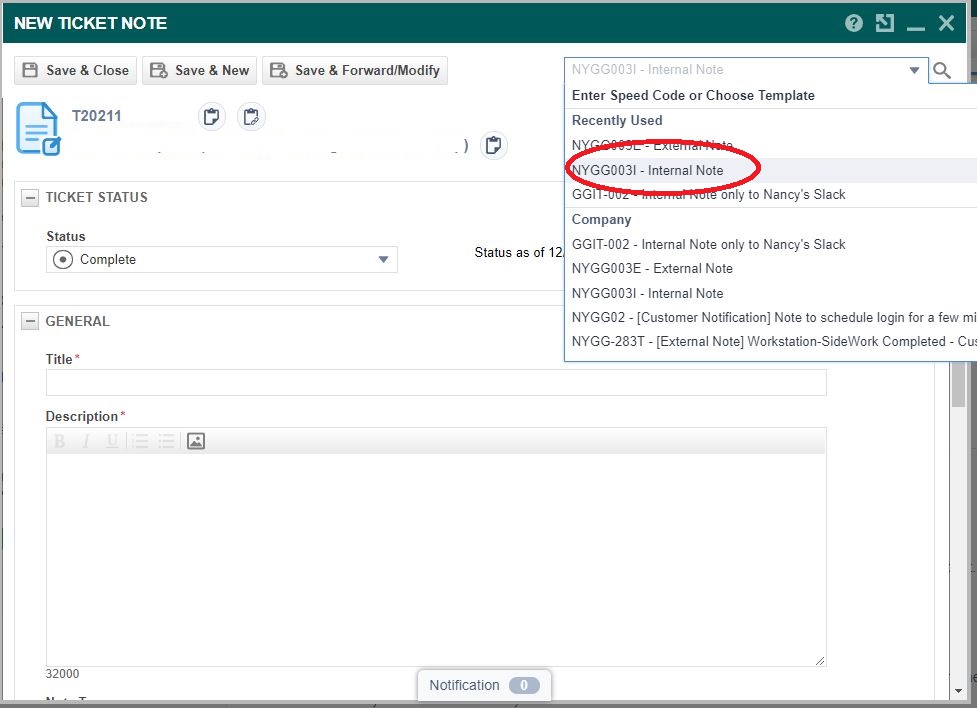 The “Internal” and External” ticket note templates are set up so that the appropriate recipients are pre-checked and the ticket will come from the correct source. For general internal and external notes, always use these templates: