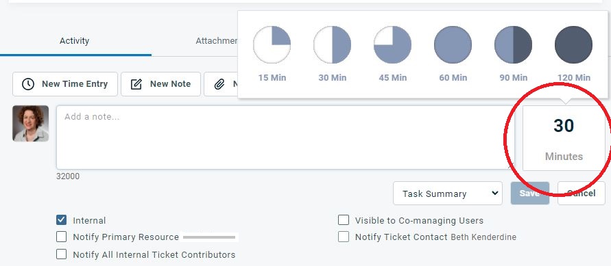 By adding minutes in the box to the right of the text field, you can turn your quick note into a time entry.