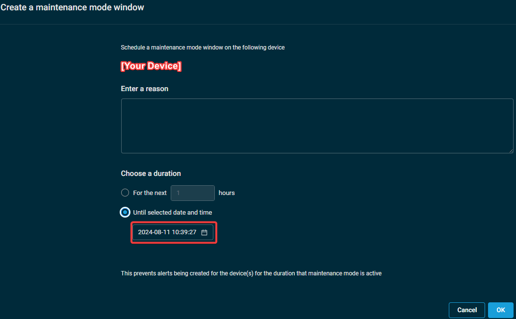 Fill out the reason box and set the desired range for the alerts to be disabled.