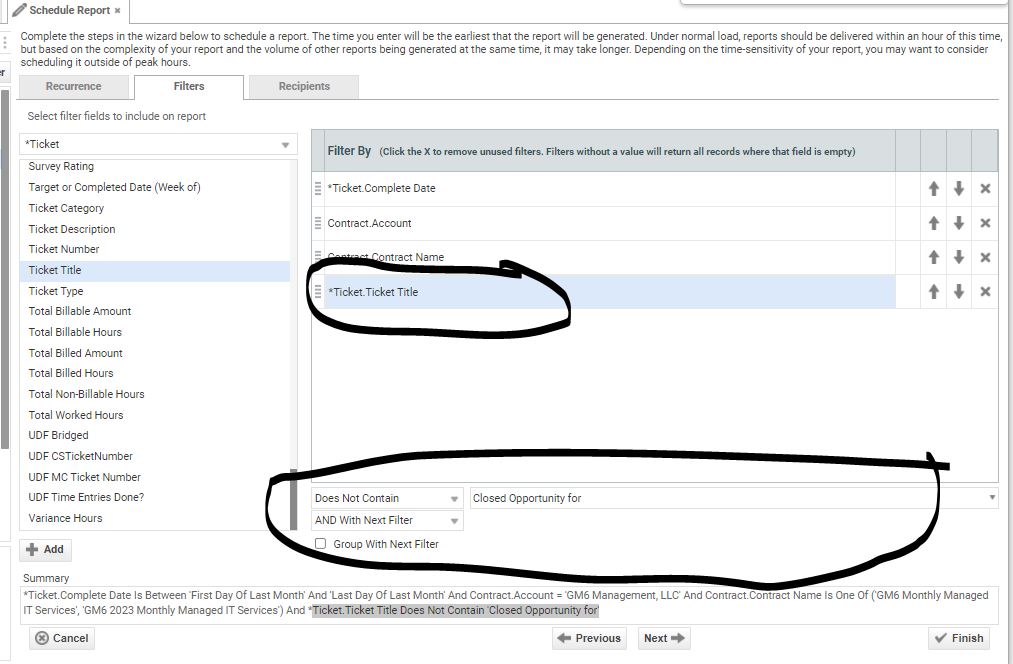 Ticket.Ticket Title Does Not Contain 'Closed Opportunity for'