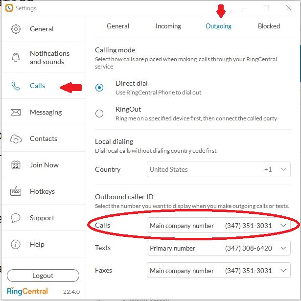 1. Please make sure your caller ID in your Ring Central App is set to show our main number. Click the gear, go to Calls, then Outgoing tab at the top.