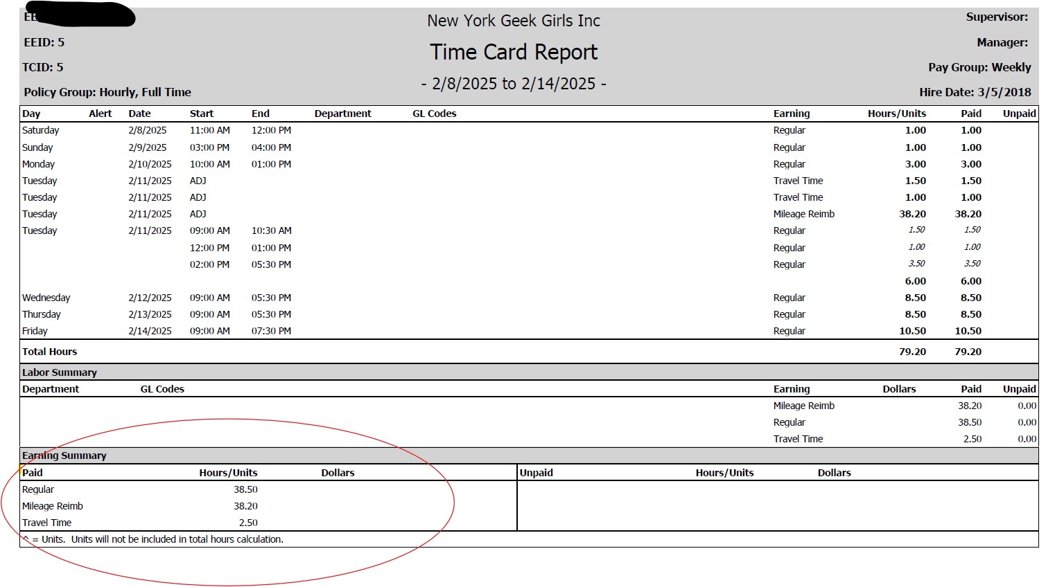 Confirm punch-outs match punch-ins; confirm employee hours. You can see a breakdown of worked hours, time-off hours and reimbursable expenses at a glance at the bottom of each employee's page.