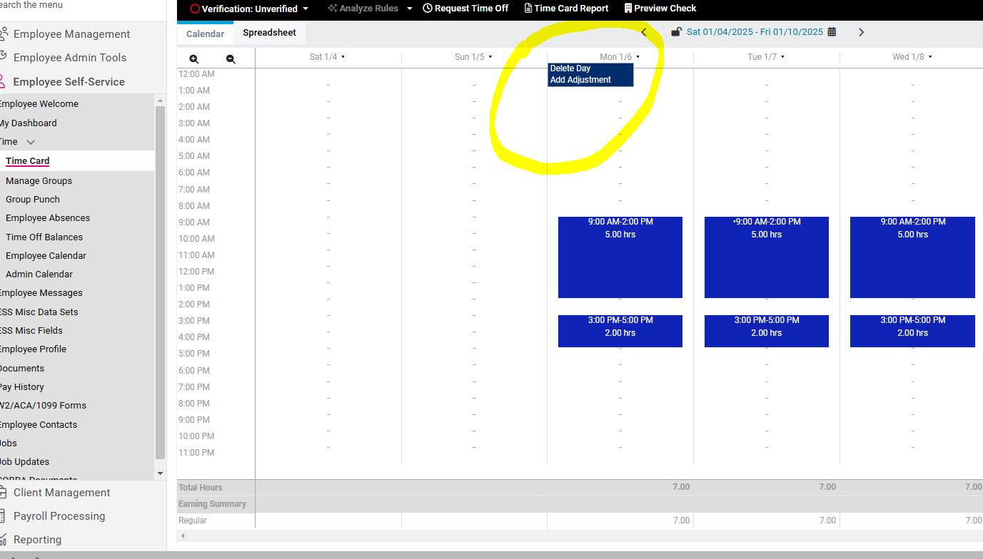 Go to Employee Self Service>Time>Time Card. From here you can click on a user to see their hours and Adjustments.