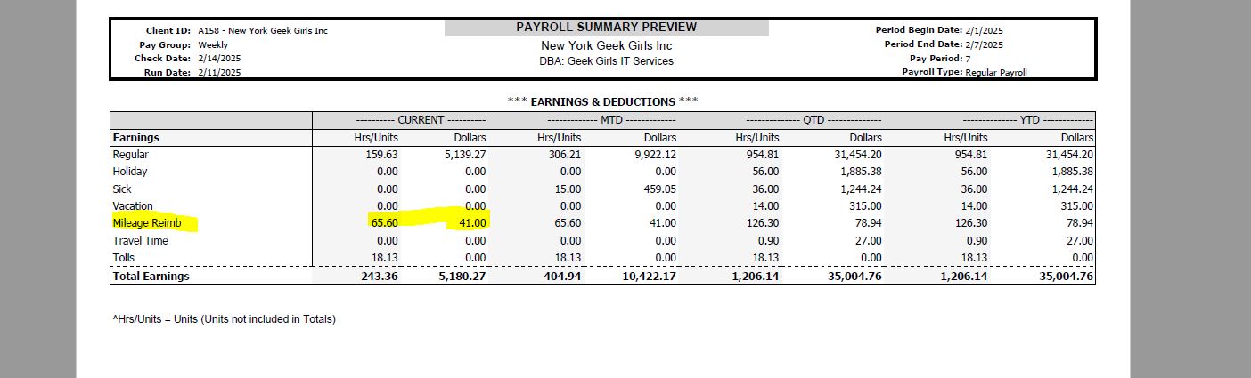 Mileage is entered as the number of miles (round trip), but in the Payroll Summary it will show the dollar amounts: