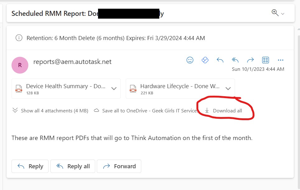 Background: The PDF reports that come from Datto are created on the Datto end in such a way that they get corrupted in Think Automation or when opened within an IMAP web interface. Forwarding them from another email address does not fix the issue. We need to download the PDFs as a zip file from the Microsoft email to a computer desktop and then attach the zip file to a new email and resend them to Think Automation.