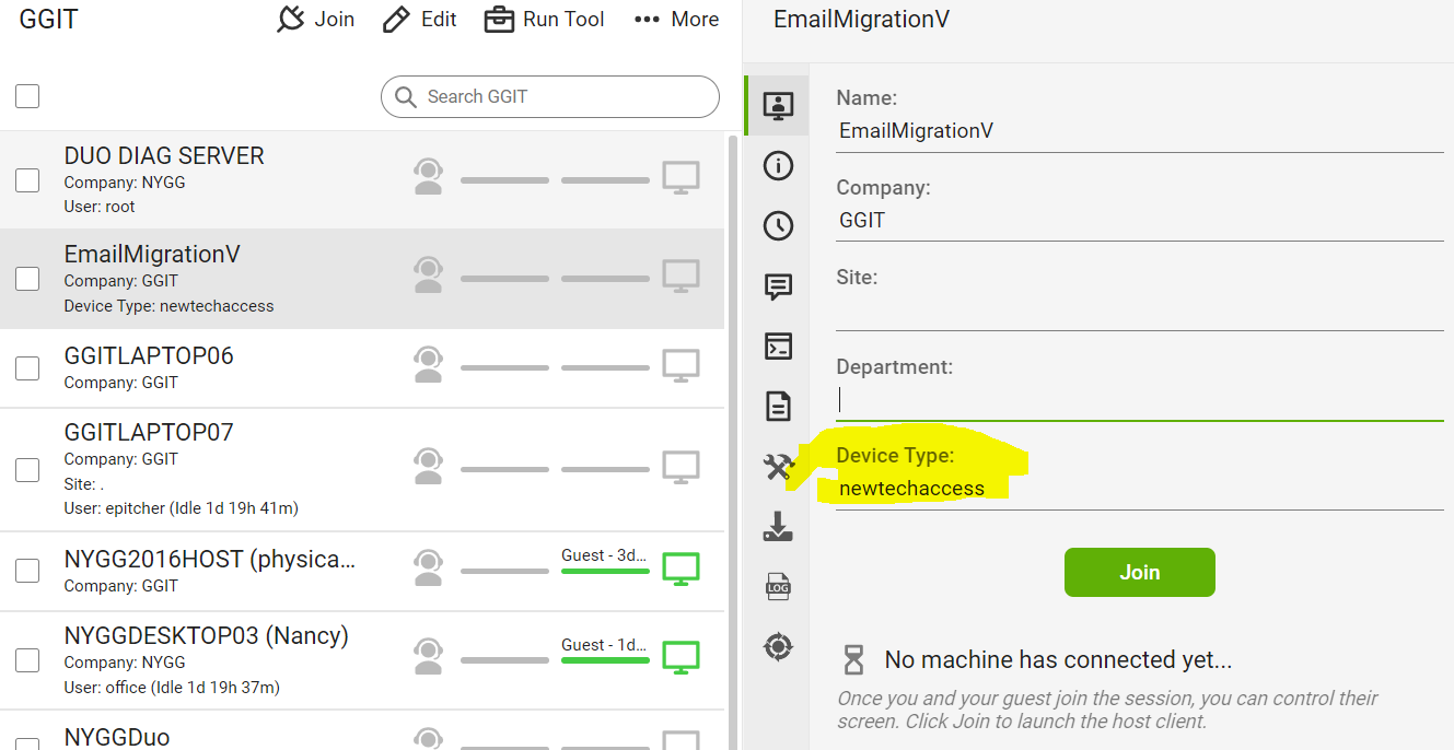 To add a machine to the New Tech Access group, add the exact phrase "newtechaccess" (no quotes) to the machine's Device Type field: