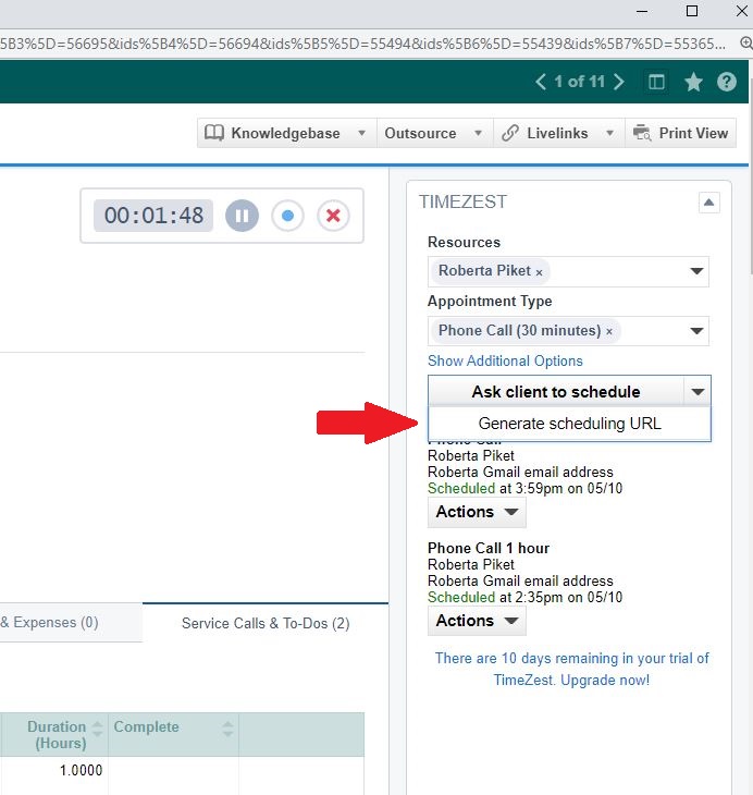 The Insights pane (on the right) on Autotask tickets contains an integration to use TimeZest to send a scheduling link to schedule tech appointments.