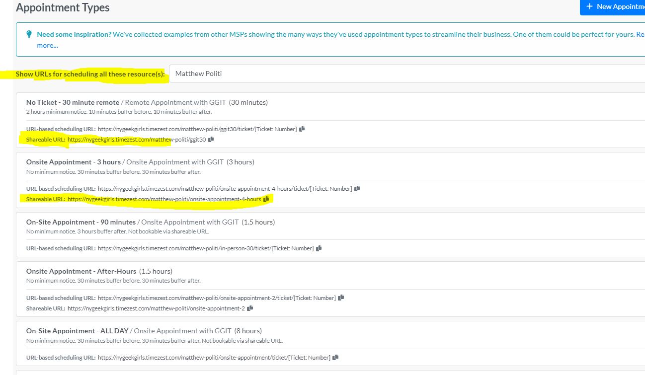 The appointment types are all listed in the TimeZest dashboard and are also visible from the AT ticket integrations panel.