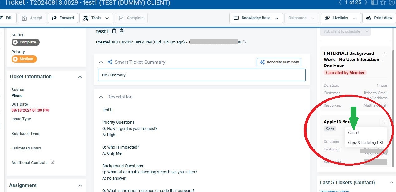 Use TimeZest every time for scheduling remote appointments. This will ensure that the customer always receives the email confirmation. If you want to schedule the appt for the customer, use the option to generate a URL. Then use the URL to schedule the appointment yourself. The service call will automatically be added to the ticket and the customer will receive a confirmation.