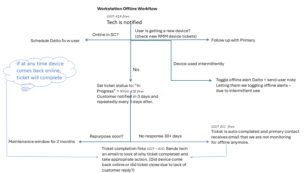 Once the ticket closes, the tech is sent a note to check why the ticket closed and respond appropriately. ( WF Rule [INTERNAL] GGIT--41D Notify primary resource that workstation offline ticket has completed)
